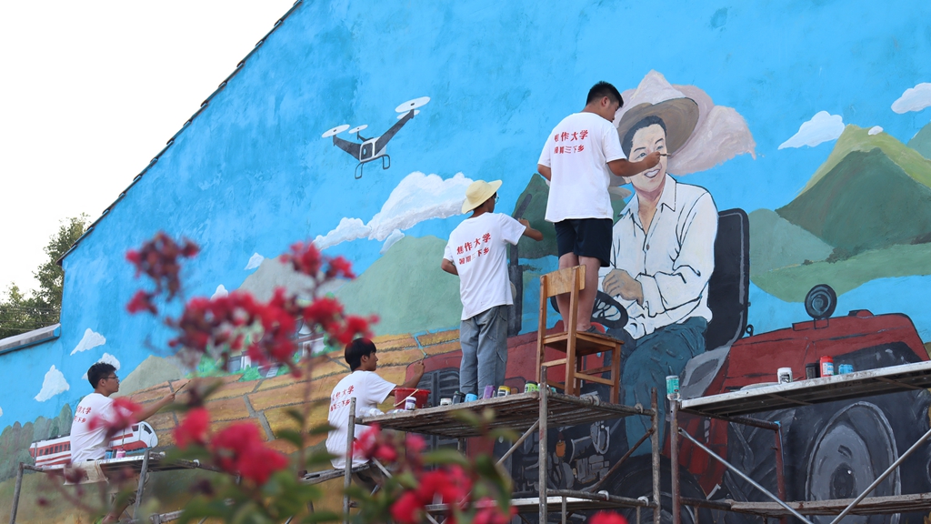 7月2日,21名师生组成的实践团抵达南临泉村。团队在前期已完成近1200平方米墙绘的基础上,精心选取适宜墙面进行补充与提升,新增绘制约600平方米。创作聚焦“党建引领”与“乡村振兴”核心主题,深入挖掘当地历史文脉、贤孝文化、农耕传统等特色元素,创作出一系列生动展现新时代乡风文明与乡村新貌的精美墙绘作品,持续为“乡村振兴青春建功行动”注入艺术动能。