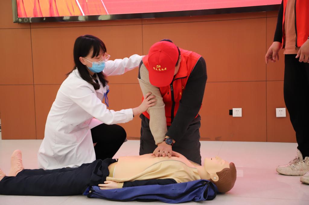 此次急救知识宣讲的内容是心肺复苏和海姆立克,分为理论讲解、观看视频、互动问答、实操演练四部分。宣讲会上,医生借助模拟人,从判断呼吸意识、呼叫求救、胸外心脏按压、开放气道、清理口腔异物、人工呼吸、自动体外除颤器(AED)的使用等进行了详细的操作示范。在医生的讲解演示下,学生干部、志愿者轮流操作整个心肺复苏和海姆立克流程,医生们在一旁认真指导,确保大家都掌握高质量的急救知识操作技能。在演练中,师生踊跃参与模拟情景,积极提问“如何止血”等急救问题,医生现场给予详细解答。