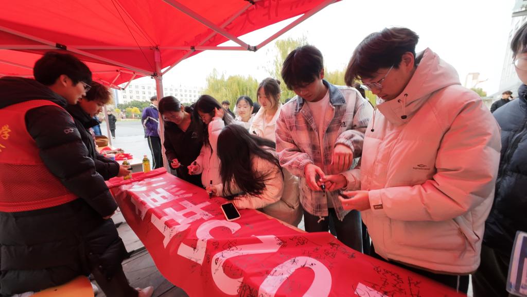 11月17日,活动正式拉开帷幕,校学生会在南北校区人流集中的区域设置大型主题横幅,广大同学怀着对共建文明宿舍、和谐校园的热忱积极响应,纷纷在横幅上郑重签名,许下践行文明公约、共同建设温馨友爱“小家园”的承诺。这一横幅签字的形式不仅标志着文化节的正式启动,更象征着全体住宿生集体参与、共建共享宿舍文化的决心与意愿。